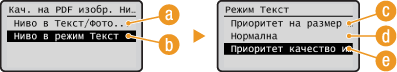 Конвертира сканиран документ в текстов PDF файл, намалявайки размера на файла в сравнение с настройка <PDF>. PDF файлът включва текстови данни, извлечени от сканирания документ чрез OCR (оптично разпознаване на символи), което ви позволява да търсите текст чрез компютър.