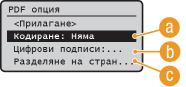 Само <Acrobat 9.0 или еквивалент/256-bit AES> или <Acrobat 10.0 или еквивалент/256-bit AES> се извежда на екрана като опция за генериране на 256-bit AES кодиран PDF. Можете да промените нивата на кодиране според нуждите си.