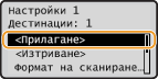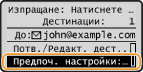 <Предпочитани настройки> <Редактиране/Изтриване> изберете настройката редактирайте настройката <Прилагане> Да . Не можете да променяте дестинации, запаметени в настройката, чрез тази процедура. Запаметете нова настройка с желаните дестинации.Ако желаете да изтриете запаметена настройка, натиснете