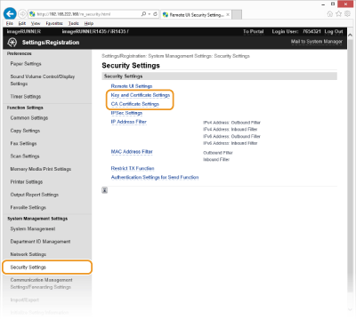 [Key and Certificate Settings] (за двойки ключове) или върху [CA Certificate Settings] (за CA сертификати).