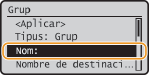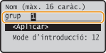 Escriviu el nom del grup fent servir el teclat numèric, seleccioneu <Aplicar> i premeu