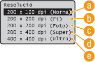 Podeu seleccionar la resolució adequada per a cada tipus de document. Com més alta és la resolució, més nítida és la imatge, però tarda més a enviar-se.