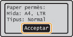Comproveu que la mida i el tipus de paper que es mostra a la pantalla estigui carregat a l'equip i premeu