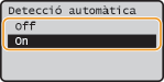 Seleccioneu <On> i premeu . L'equip detecta i estableix automàticament el mode de comunicació i el tipus d'Ethernet que es pot utilitzar.