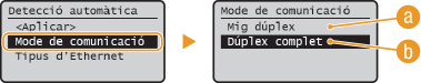 Seleccioneu <Mode de comunicació>    seleccioneu <Mig dúplex> o <Dúplex complet>  .