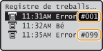 Si es produeix un error, com ara quan la impressió falla o la memòria està plena, apareix un número de tres dígits (codi d'error) en un informe o a la pantalla <Monitor estat>. Comproveu la informació següent per obtenir detalls sobre les causes i solucions de cada codi d'error. Per obtenir detalls sobre la informació dels informes i com imprimir-los, vegeu