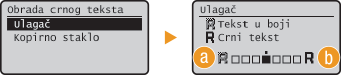 Kada skenirate dokumente u boji možete podesiti boju crnog ili vrlo tamnog teksta tako da je što sličniji originalnom dokumentu ili možete podesiti jasnoću crnog teksta kako bi ga bilo lakše čitati. Vrijednosti za ulagač i kopirno staklo možete zasebno postaviti.
