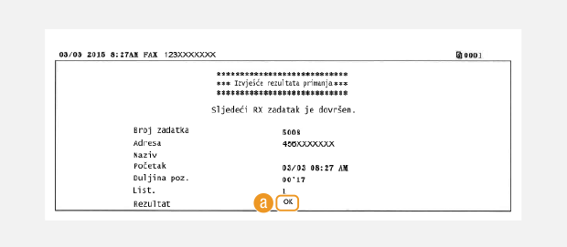 "OK" označava da je fask uspješno primljen, dok "NG" i tri zamenke (kôd pogreške) označavaju da prijenos faksa nije uspio (