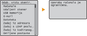 Ako je potvrđen okvir [Scan], onemogućeno je skeniranje dokumenata na USB memorijske uređaje, u e-poštu i na datotečne poslužitelje. Možete i onemogućiti skeniranje dokumenata na računala putem mogućnosti <Računalo> i <Udaljeni skener>. No skeniranje dokumenata na računalo možete onemogućiti samo za sve ID-brojeve odjela. (Blokiranje poslova kada ID odjela nije poznat).