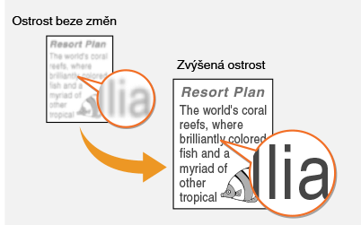 Můžete upravit ostrost kopírovaného obrazu. Ostrost zvyšte, chcete-li zostřit rozmazaný text a linky, případně snižte, chcete-li zlepšit vzhled fotografií v časopise.