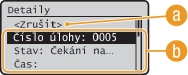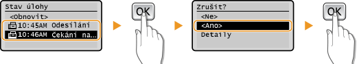 Zobrazí se počet odesílaných dokumentů, nastavení a další údaje. Chcete-li si pouze zkontrolovat údaje bez provedení zrušení, vraťte se na hlavní obrazovku faxování stisknutím