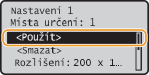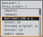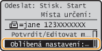 <Oblíbená nastavení> <Uložit/Odstranit> vyberte nastavení upravte nastavení <Použít> <Ano> . Tímto postupem nemůžete změnit místa určení uložená v nastavení. Uložte nové nastavení s požadovanými místy určení.Chcete-li odstranit uložené nastavení, stiskněte