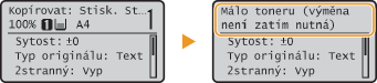 <Nízká>: Dochází toner. Ujistěte se, že máte připravenou náhradní tonerovou kazetu.