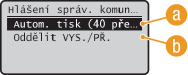 Vyberte <Zapnuto>, chcete-li tisknout výsledky odesílání a výsledky příjmu zvlášť, nebo <Vypnuto>, chcete-li tisknout obojí výsledky na jeden list papíru.