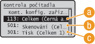 Vyberte, chcete-li zkontrolovat celkový počet všech okopírovaných a vytištěných stránek, včetně výtisků přijatých faxů, hlášení a seznamů.