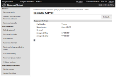 Abyste mohli změnit nastavení funkce AirPrint, přihlaste se v režimu správce systému.