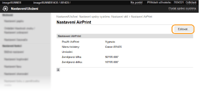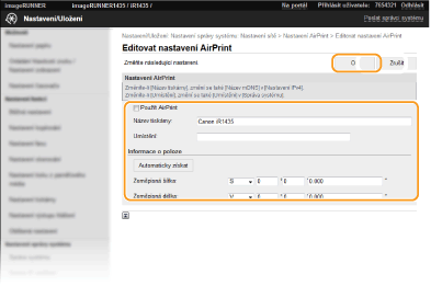 [Použít AirPrint]/[Umístění:]/[Zeměpisná šířka:]/[Zeměpisná délka:]