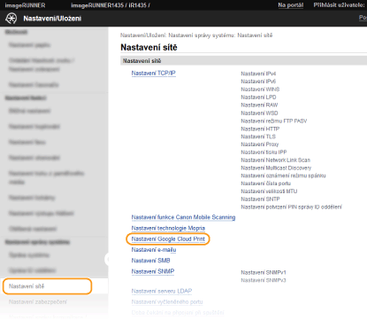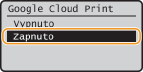 Chcete-li zakázat funkci Google Cloud Print, vyberte možnost <Vypnuto>.