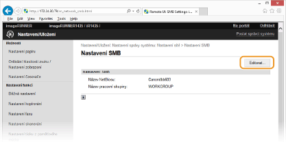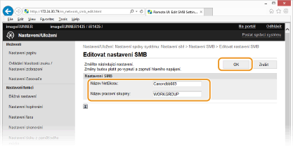 SMB (Server Message Block) představuje protokol ke sdílení zdrojů, například souborů a tiskáren, s více než jedním zařízením v síti. Zařízení využívá protokol SMB k ukládání naskenovaných dokumentů do sdílené složky. Podle používané sítě může být nutné nastavit název systému NetBIOS a pracovní skupiny.