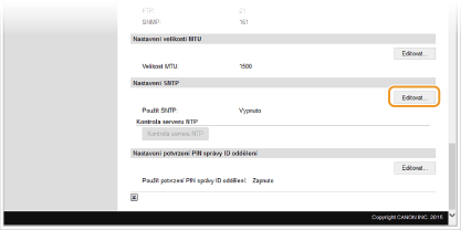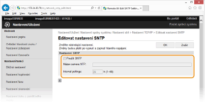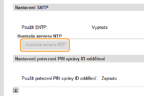 Testování komunikace se serverem NTP/SNTPMůžete otestovat, zda zařízení komunikuje se zaregistrovaným časovým serverem prostřednictvím protokolu SNTP. Přejděte na [Nastavení/Uložení]
