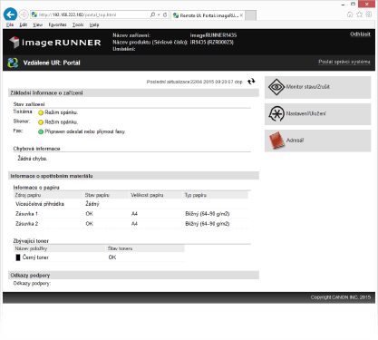 Chcete-li zařízení vzdáleně ovládat, je třeba do webového prohlížeče zadat IP adresu zařízení a spustit vzdálené uživatelské rozhraní. IP adresu nastavenou pro zařízení si předem zkontrolujte (