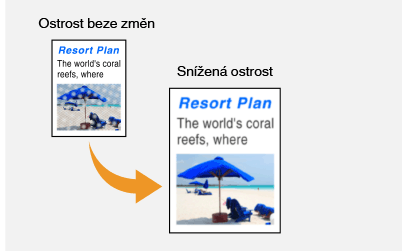 Zařízení umožňuje úpravu ostrosti skenovaného obrazu. Ostrost zvyšte, chcete-li zostřit rozmazaný text a linky, případně snižte, chcete-li zlepšit vzhled fotografií v časopise.