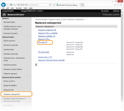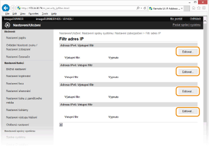 Pokud zadáte IP adresy nesprávně, může se stát, že nebude možný přístup do zařízení prostřednictvím vzdáleného uživatelského rozhraní. V takovém případě je třeba nastavit <Filtr adres IPv4> nebo <Filtr adres IPv6> na <Vypnuto>. Filtr adres IPv4 Filtr adres IPv6