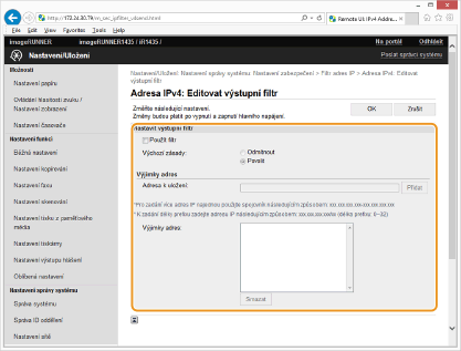 Vyberete-li tuto volbu, pak komunikační pakety, které jsou odeslány nebo přijaty ze zařízení, jejichž IP adresy jsou zadány v seznamu [Výjimky adres], budou blokovány. Komunikace s ostatními zařízeními je povolena.