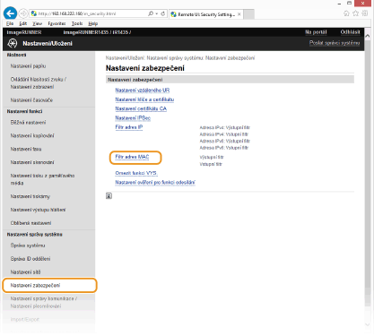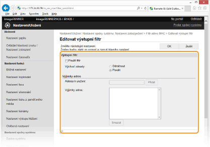 Zkontrolujte správnost zadaných adres Zadáte-li MAC adresy nesprávně, nebude možné se k zařízení připojit prostřednictvím vzdáleného uživatelského rozhraní. V takovém případě je třeba nastavit <Filtr adres MAC> na <Vypnuto>. Filtr adres MAC