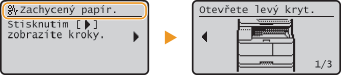 naobrazovce zobrazíte jednoduchá řešení. Pokud potřebujete odstranit zachycený papír a postupy na displeji jsou obtížně pochopitelné, podívejte se do následujících částí. Než začnete zachycení papíru odstraňovat, pečlivě si přečtěte opatření v Údržba a kontroly.