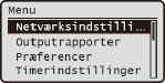 , vises skærmen <Menu>. På denne skærm kan du begynde at angive generelle maskinindstillinger som f.eks. <Almene indstillinger> eller <Timerindstillinger> samt de fleste indstillinger for hver funktion, f.eks. kopiering og scanning.