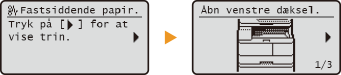 Når der opstår en fejl, vil der i visse tilfælde blive vist instruktionerne i, hvordan der skal reageres på fejlen. Følg anvisningerne på skærmen for at løse problemet. Den skærm, der vises, når der opstår et papirstop, er vist som eksempel herunder (