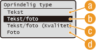 Du kan vælge optisk billedkvalitet for kopien afhængigt af dokumenttypen som f.eks. dokumenter, der kun har tekst, dokumenter med diagrammer og grafer eller magasinfotos.