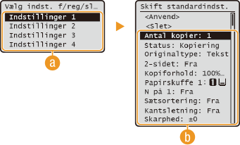 <Favoritindstillinger> <Registrer/slet> vælg indstillingen <Slet> <Ja> .De registrerede indstillinger gemmes, også når maskinen er slukket.