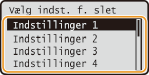 <Favoritindstillinger> ![]() ![]() <Registrer/slet> vælg indstillingen <Slet> <Ja> .De registrerede indstillinger gemmes, også når maskinen er slukket.