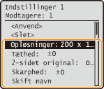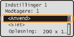 <Favoritindstillinger> <Registrer/slet> vælg indstillingen rediger indstillingen <Anvend> <Ja> . Du kan ikke ændre de modtagere, der er registreret i indstillingen, med denne procedure. Registrér en ny indstilling med de ønskede modtagere.Hvis du vil slette en registreret indstilling, skal du trykke på