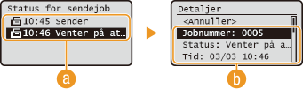 <Detaljer>Viser detaljerede oplysninger om det dokument, der vælges på listen. Hvis du har angivet flere destinationer, vises antallet af angivne destinationer på skærmen. Hvis du vil kontrollere oplysninger for flere angivne modtagere, skal du vælge <Antal modtagere>, og trykke på