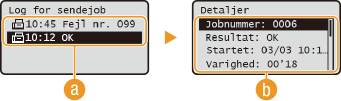 .![]() <Log for sendejob>/<Log for modtagejob>Viser en liste over de dokumenter, der er blevet sendt og udskrevet. <OK> vises, når et dokument er blevet sendt eller modtaget, og <Fejl> vises, når et dokument ikke kunne sendes eller modtages, fordi det blev annulleret, eller der opstod en fejl.