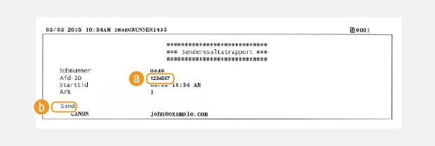 Modtagerens navn og adresse eller hostnavn vises. Hvis du sendte dokumentet e-mail, indikerer rapporten overførselsresultatet mellem maskinen og e-mailserveren, ikke mellem maskinen og modtageradressen. Den trecifrede fejlkode udskrives ikke, heller ikke hvis overførslen mislykkedes. Hvis du vil kontrollere fejlkoden, skal du udskrive en kommunikationsstyringsrapport (
