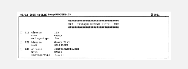 Du kan printe en liste for at tjekke detaljerne for de modtagere, der er registreret i adressebogen. Lister kan printes separat for registreringstyperne <Kodet opkald>, <Hurtigkald> og <Gruppe>.