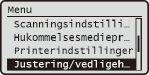 Alle indstillinger om justering og vedligeholdelse vises med korte beskrivelser. Standardindstillingerne er angivet med en daggert (