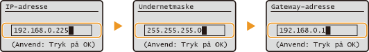 <Undernetmaske> <Gateway-adresse>.Angiv indstillingen ved hjælp af taltasterne, og tryk på
