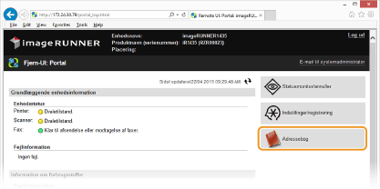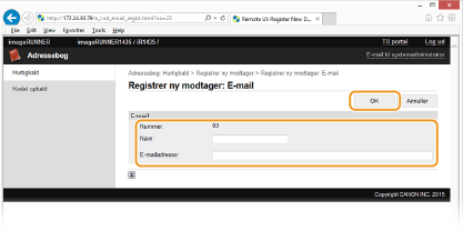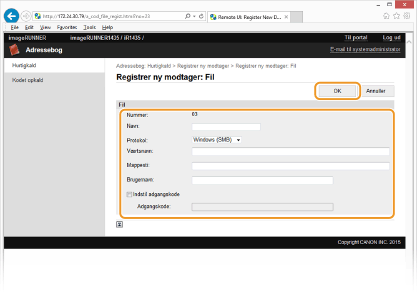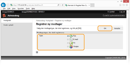 Dette afsnit beskriver, hvordan du registrerer e-mail- og filservermodtagere med Remote UI. Filservermodtagere kan kun registreres med Remote UI.