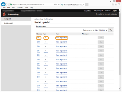 Du kan redigere en registreret modtager ved at klikke på det tilhørende tekstlink under [Nummer], [Type] eller [Navn].