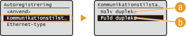 vælg <Halv dupleks> eller <Fuld dupleks> .![]() <Halv dupleks>Sender og modtager kommunikationsdata skiftevis. Vælg, om maskinen er tilsluttet en netværksenhed, der anvender halv dupleks.