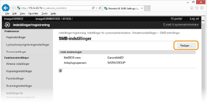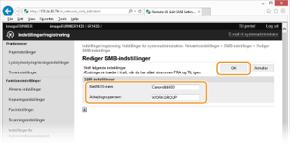 SMB (Server Message Block) er en protokol til deling af ressourcer, f.eks. filer og printere, hvor der er flere end én enhed på et netværk. Maskinen anvender SMB til at gemme scannede dokumenter i en fælles mappe. Afhængigt af dit netværk kan det være nødvendigt at angive NetBIOS-navn og arbejdsgruppenavn.