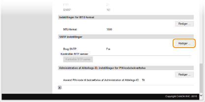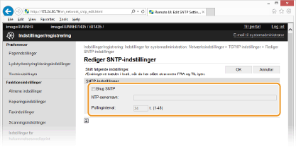 Maskinens SNTP understøtter både NTP- (version 3) og SNTP-servere (version 3 og 4).