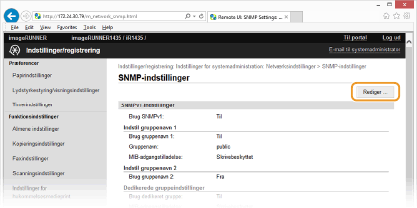 Hvis begge SNMP-versioner er aktiveret, anbefales det, at MIB-adgangstilladelse i SNMPv1 angives til [Skrivebeskyttet]. MIB-adgangstilladelsen kan indstilles uafhængigt i SNMPv1 og SNMPv3 (og for hver bruger i SNMPv3). Hvis [Læs/skriv] (fuld adgangstilladelse) vælges i SNMPv1, negerer det de robuste sikkerhedsfunktioner, der er et kendetegn ved SNMPv3, fordi de fleste af maskinindstillingerne så kan kontrolleres med SNMPv1.