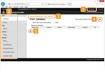 Viser status for de aktuelle dokumenter til udskrivning og historik for udskrivning, kopiering samt afsendte og modtagne dokumenter. Du kan også kontrollere status for maskinen.