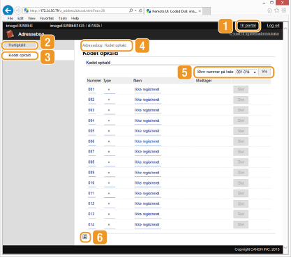 Viser kodeopkaldsnumrene og listen med hurtigkaldstaster, der er registreret i adressebogen. Du kan også registrere eller redigere adressebogen, når du logger på i systemadministratorstatus.